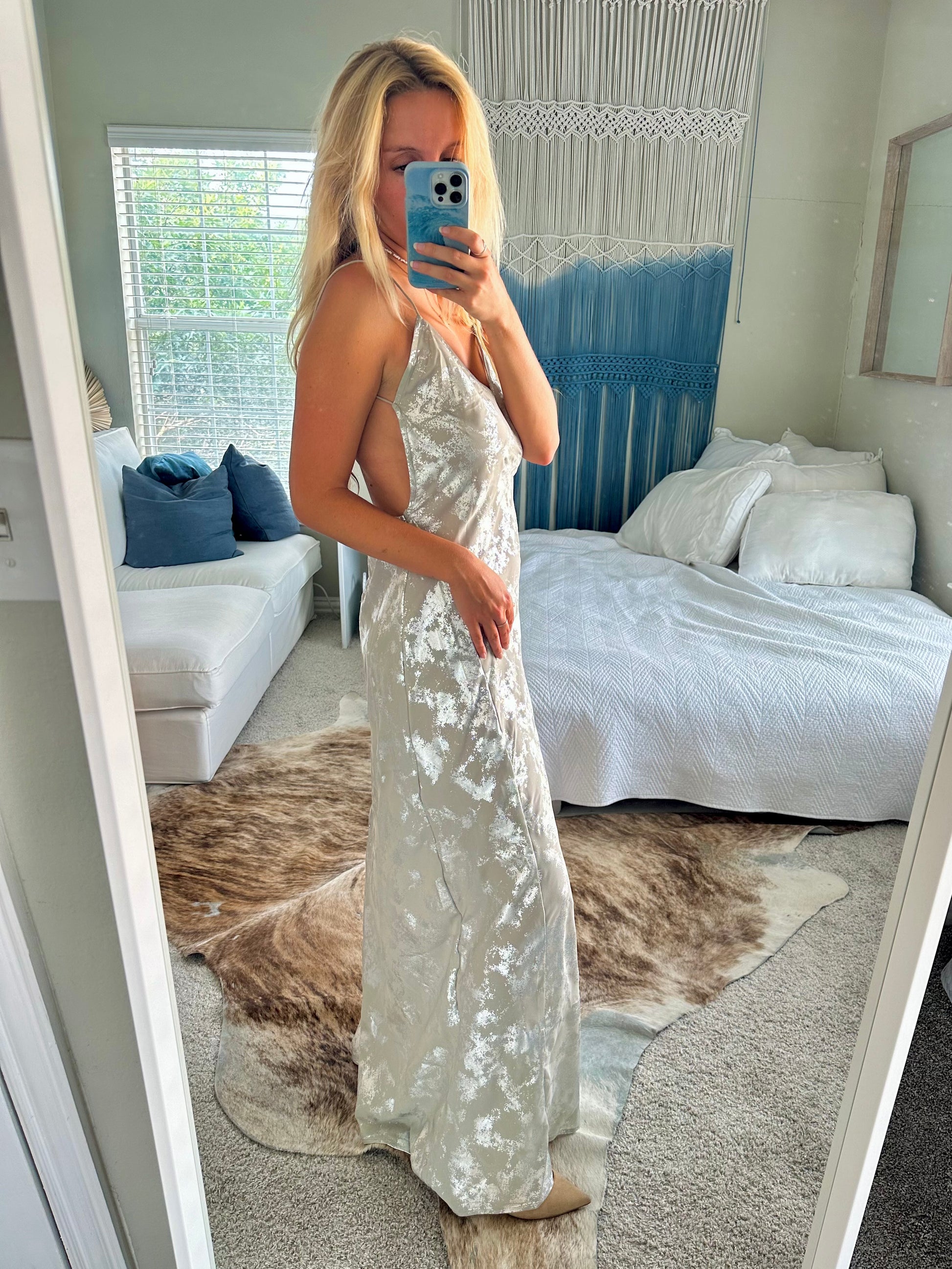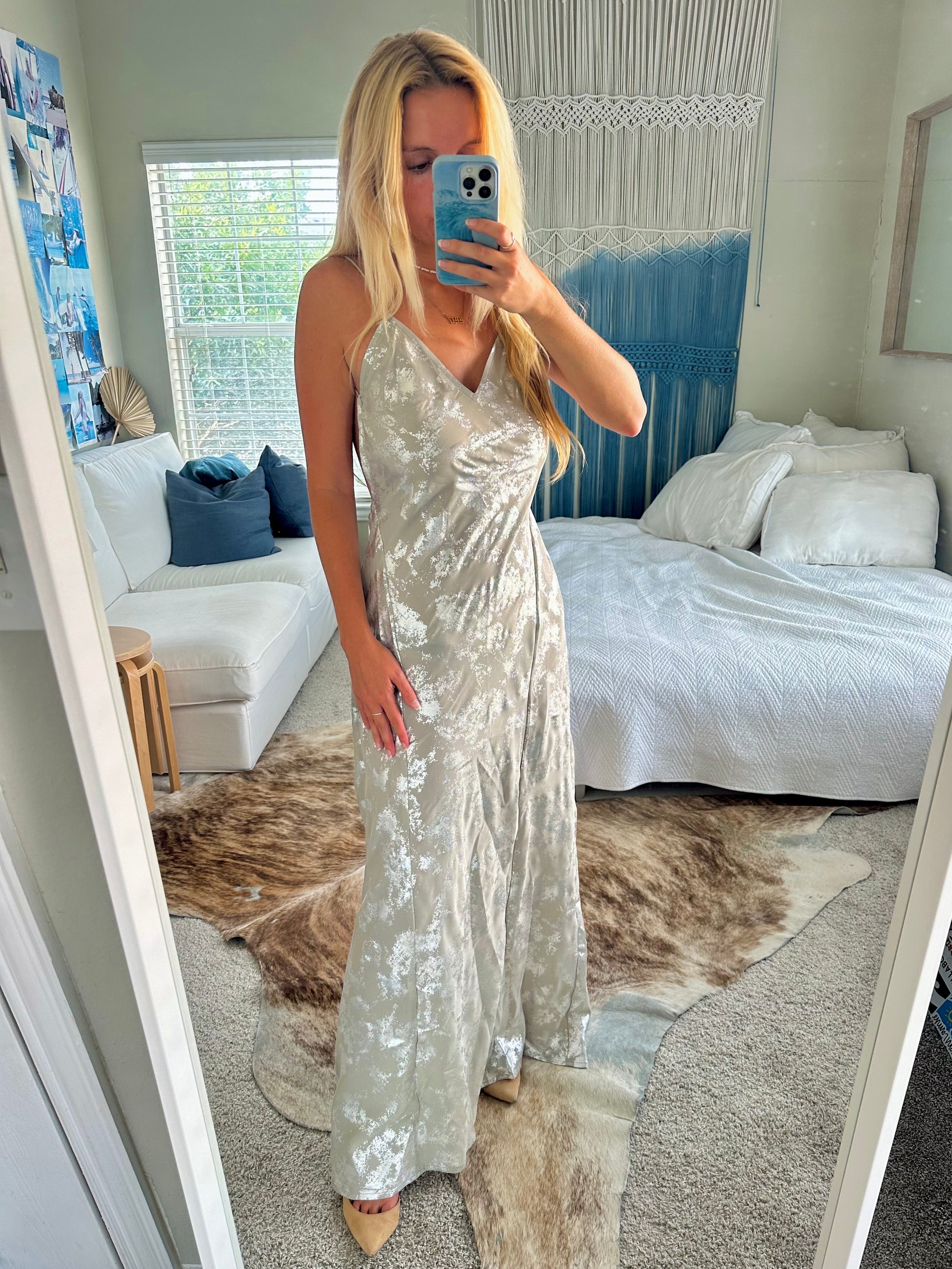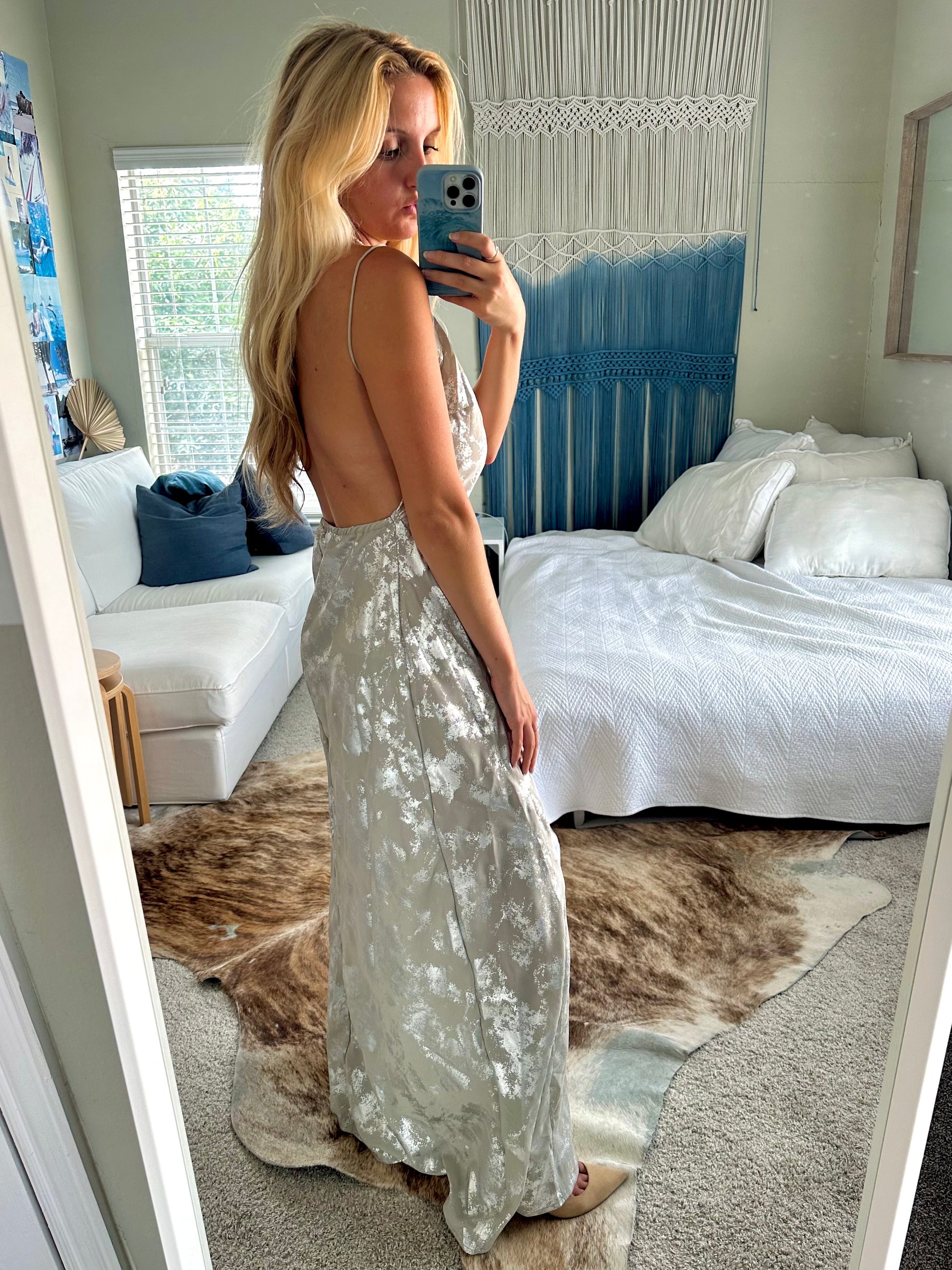 the perfect dress for a spicy night out. this metallic foil slip dress features a v-neck and thin shoulder straps that lead to an open back. the elastic waistband in the back creates a hip-hugging silhouette that flatters your curves.