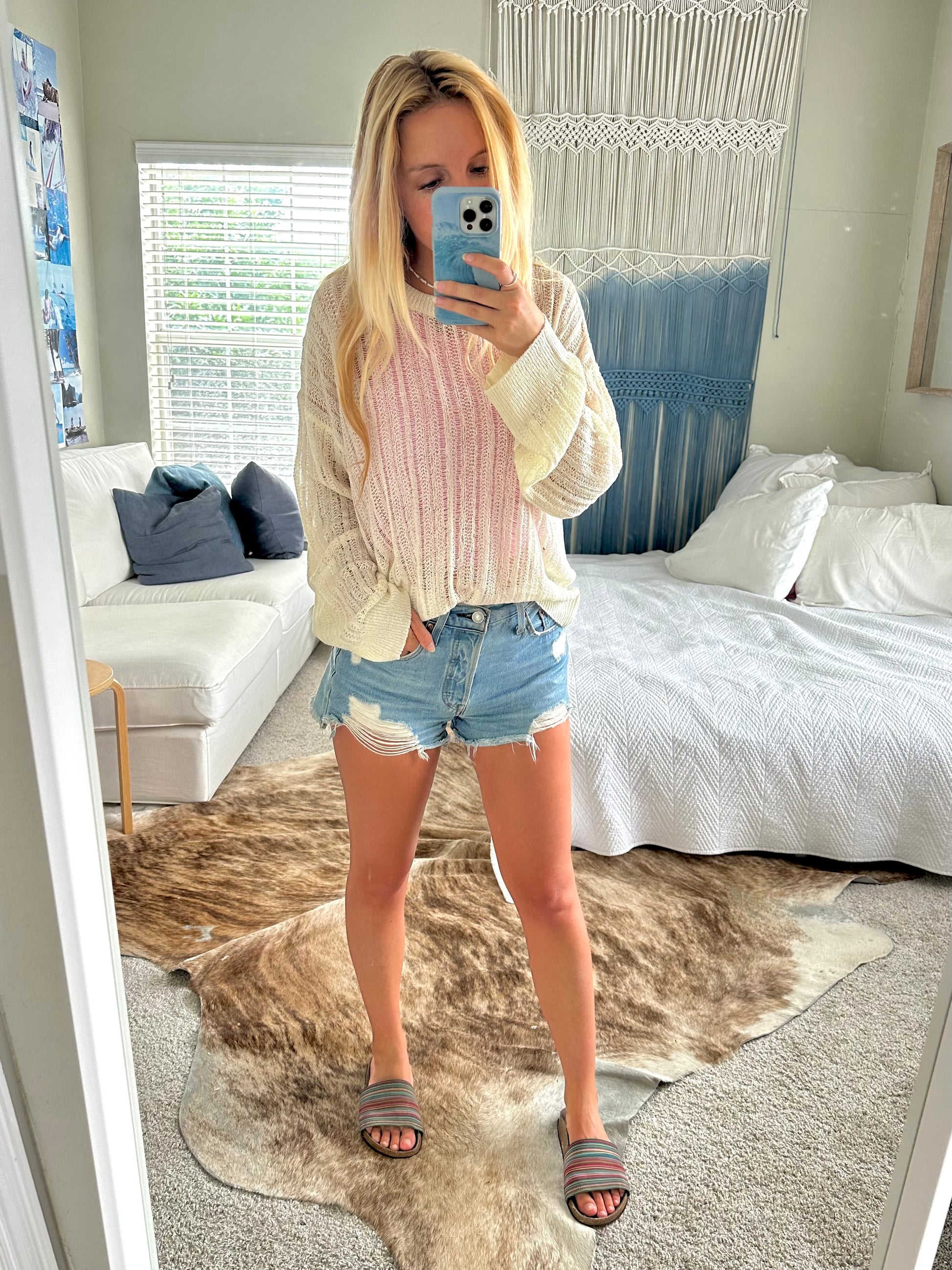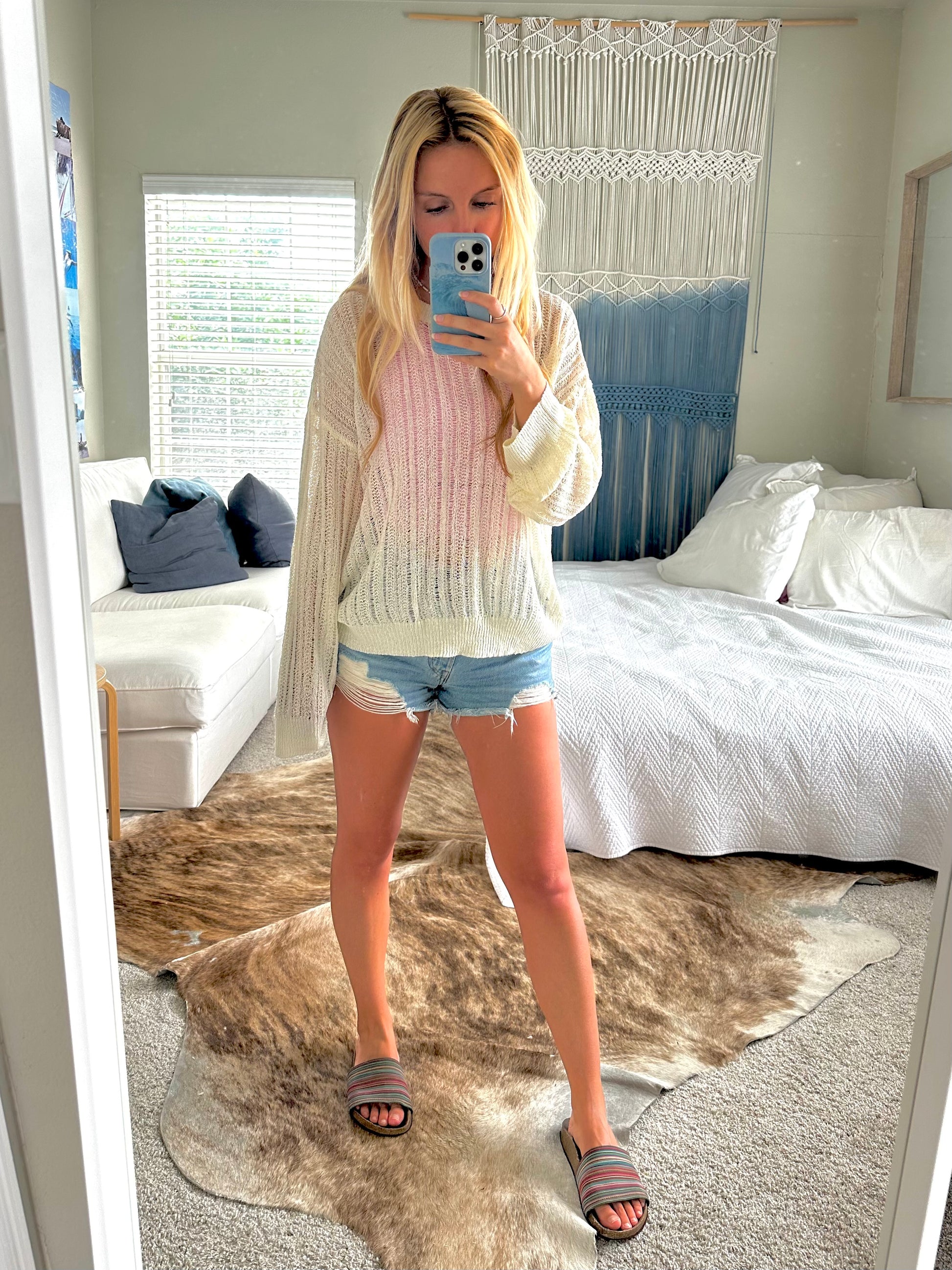 take it easy in this subtle open knit sweater. featuring a relaxed fit, ribbed hems and a soft whipped cream color, this lightweight sweater is great for those chilly summer nights or even as a swimsuit coverup.