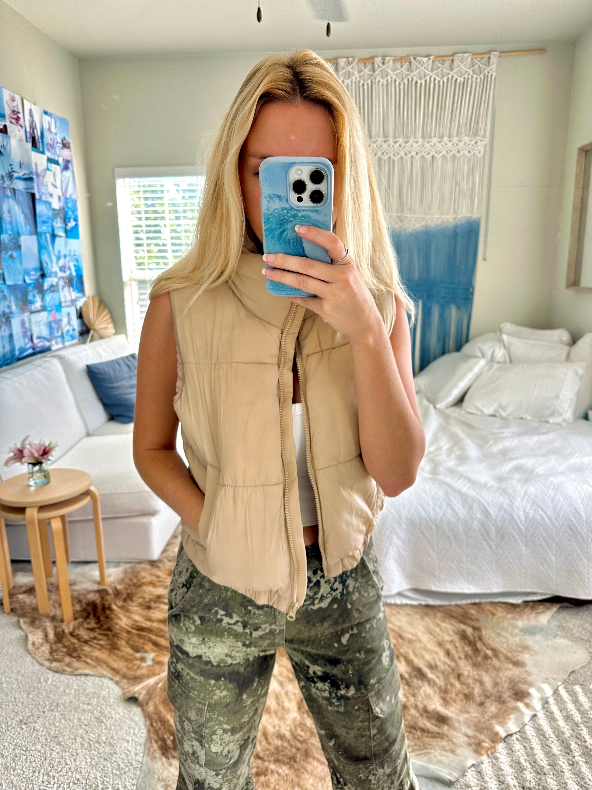 this high neck puffer vest rides with you rain or shine. the slick nylon fabric and side pockets make this vest fully functional and ever so cute! endless outfit options await.