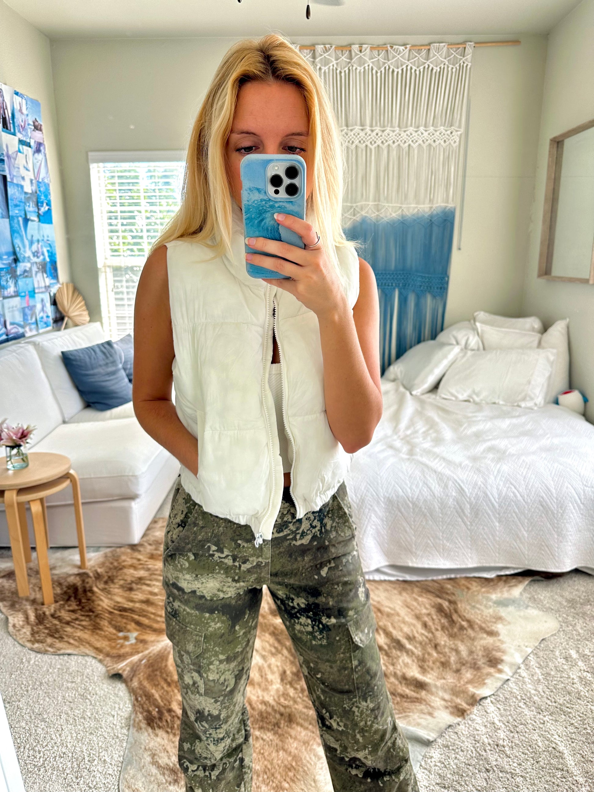 this high neck puffer vest rides with you rain or shine. the slick nylon fabric and side pockets make this vest fully functional and ever so cute! endless outfit options await.