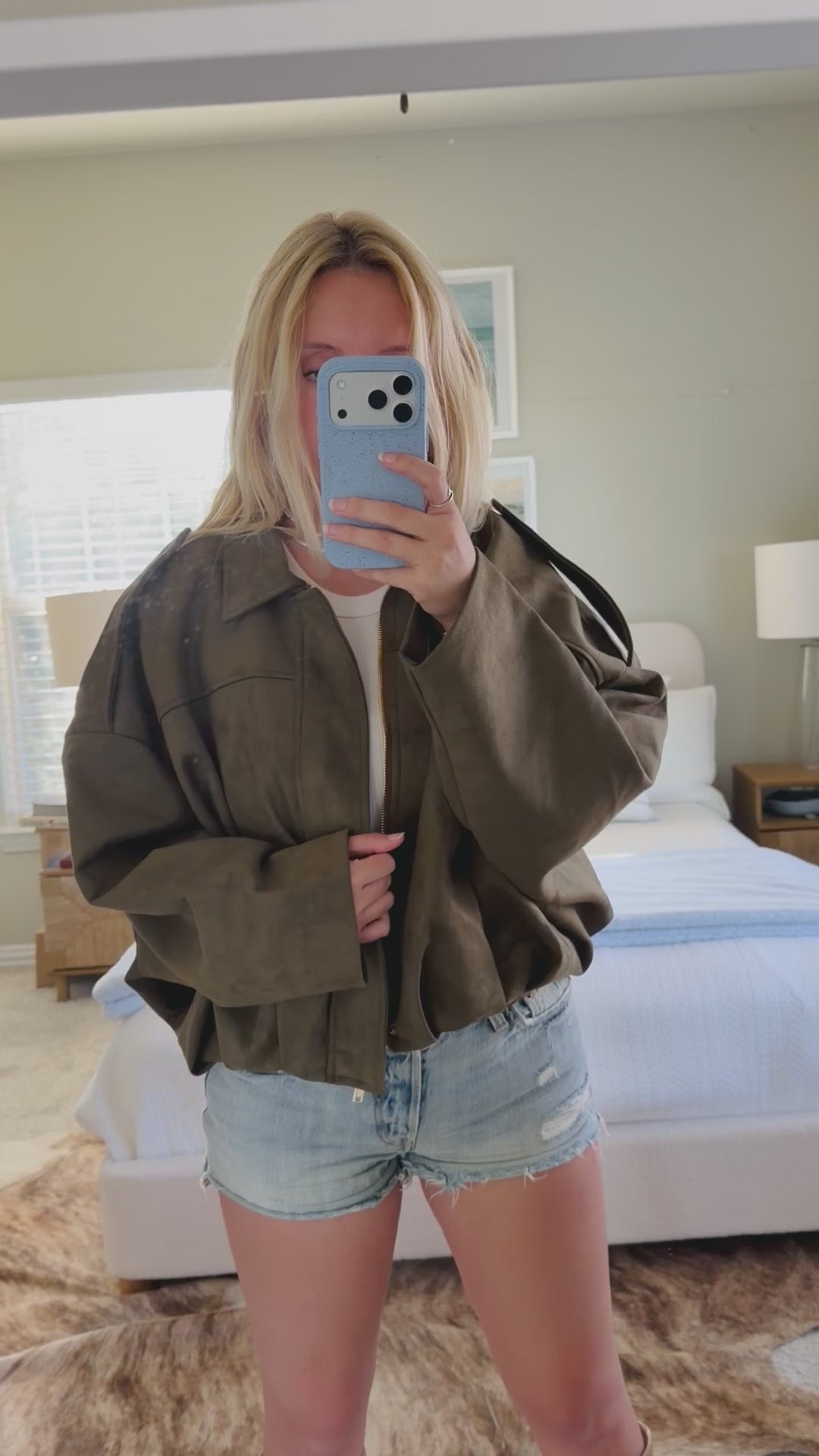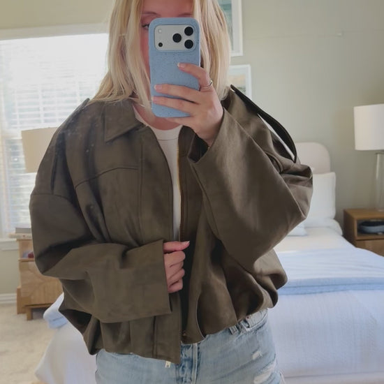 we are truly loving this olive suede jacket! it has an oversized fit and bubbles out for a super cute & flattering silhouette!